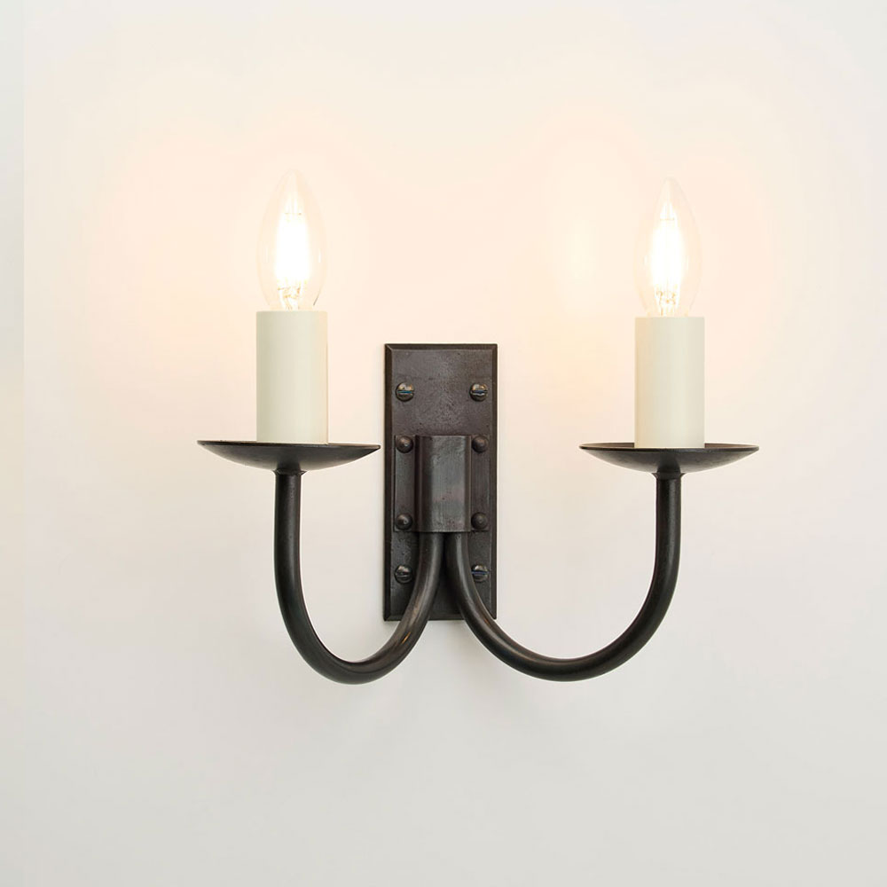 One of our most popular wrought iron wall lights, featuring a stylish backplate with neat bevelled straight edges. This timeless design has a choice of candle tube in either a matching black or an ivory finish. This classic double wall lamp is also available as a single.