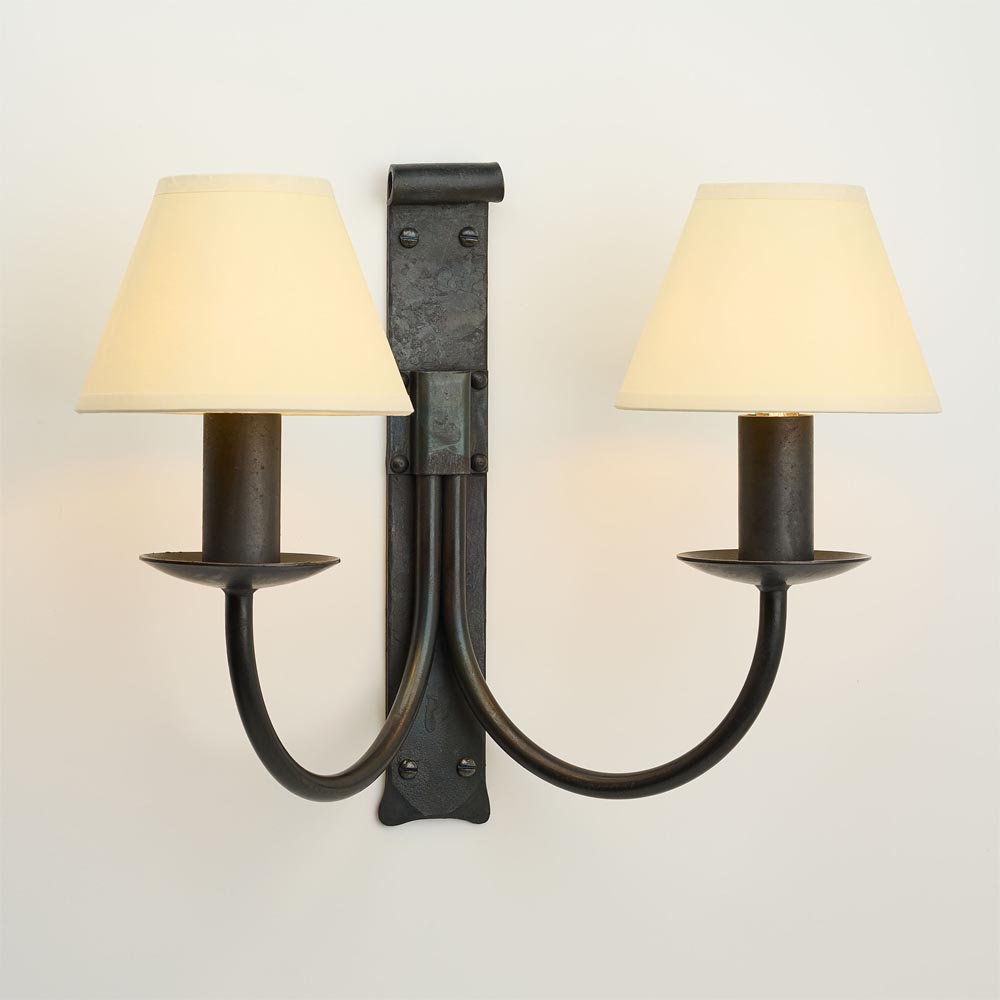 The Swaine large double wall light is one of the most popular wall lights due to the classic design. Sleek and stylish with a nod to the blacksmith’s craft. It is also available in a matching large single wall lamp. Also available as a standard size single and a standard size double with the smaller back plate.