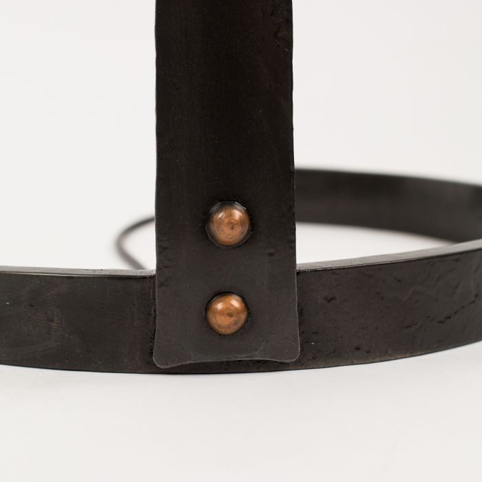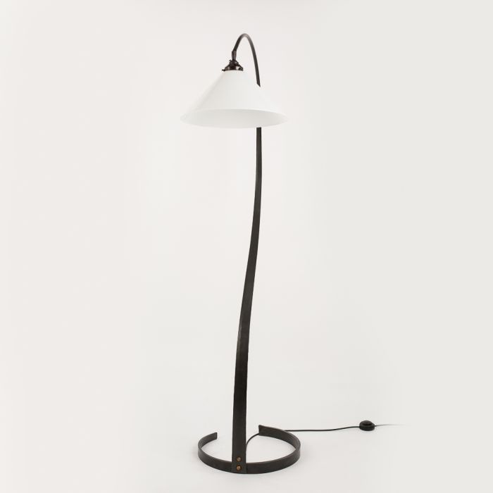 Handmade wrought iron floor lamp – designed and made by skilled blacksmiths. Distinctive and dramatic, it's a unique floor light which celebrates metalwork and craftsmanship. The elegant swan neck design allows the item to sit beautifully alongside a chair and the weighty metal base, forged in solid steel and connected by two copper rivets, ensures a firm footprint. Perfect for task lighting or a cosy reading corner, the lamp will accept a selection of shades. We prefer the prismatic glass coolie. A BC fitting accepts a range of bulbs and a foot switch is supplied along the cable for easy operation. Please note that due to it's size and shape, our Wooldale standard lamp is dispatched on a pallet or you are welcome to arrange a collection from the forge.
